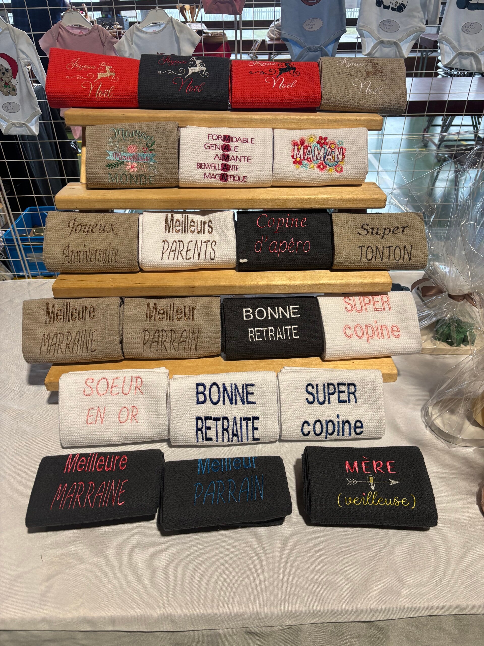 Ce sont mes linges de cuisine personnalisés, uniques et originaux, brodés avec un prénom ou un petit mot.
